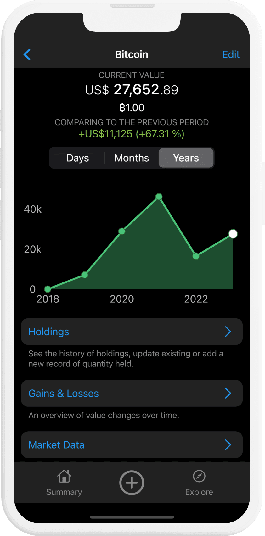 Yes, but it’s as easy as creating contacts or storing phone numbers. Sumio automatically updates the currency exchange rates and market values of your investments (stocks, funds, ETFs, cryptocurrencies, precious metals).
